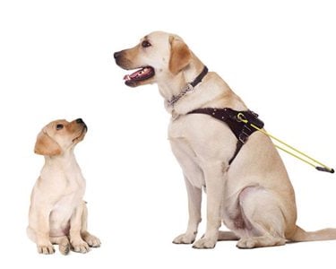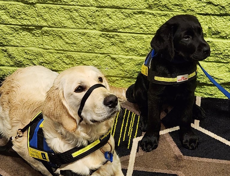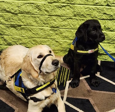 6 month old Golden Retriever Bruzzy & 10 week old black lab Zeus are undergoing training.