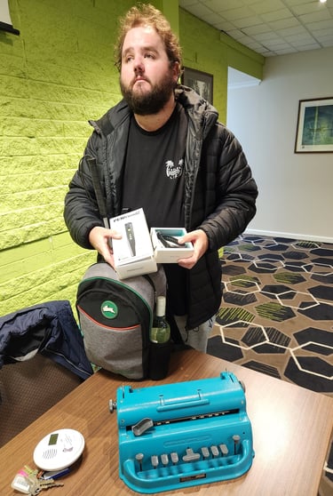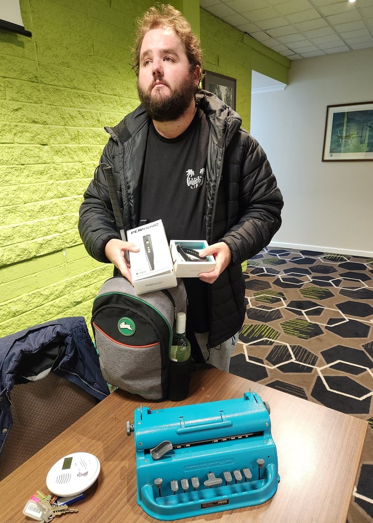 Zac Cheney showing his braille writer to the group as well as some of aids that help him in his daily life